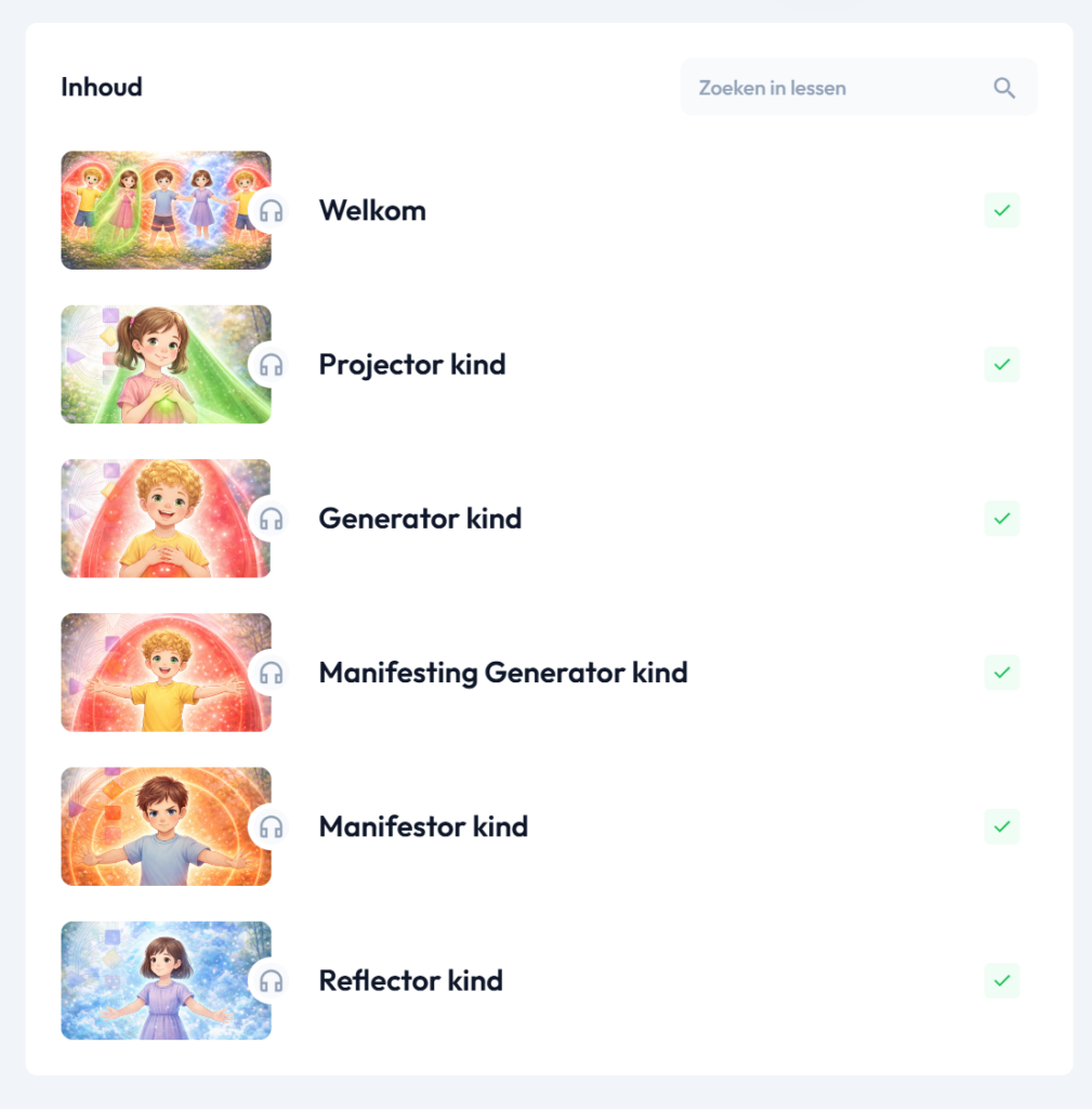 Op dit moment vind je in het programma een eerste basis aan audio’s waarin ik je meeneem in de verschillende energietypes van kinderen en hoe je daar als ouder op kunt afstemmen in het dagelijks leven. Vanuit daar bouwen we samen verder. Iedere maand voeg ik nieuwe audio’s en inzichten toe, onder andere over autoriteiten, gedrag in centra’s, emoties (en nog veel meer) en leg ik verschillende voorbeelden van dynamieken binnen een gezin, zodat je steeds een laagje dieper gaat in het begrijpen van jouw kind.